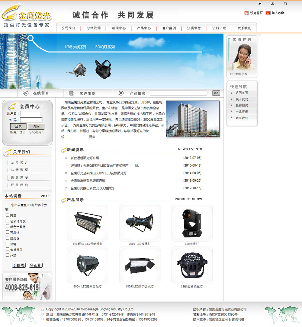 湖南金鹰灯光实业有限公司,专业从事数字换色器、电子显示屏及舞台灯具的开发、生产和销售,是中国文艺演出物资协会会员, 公司以