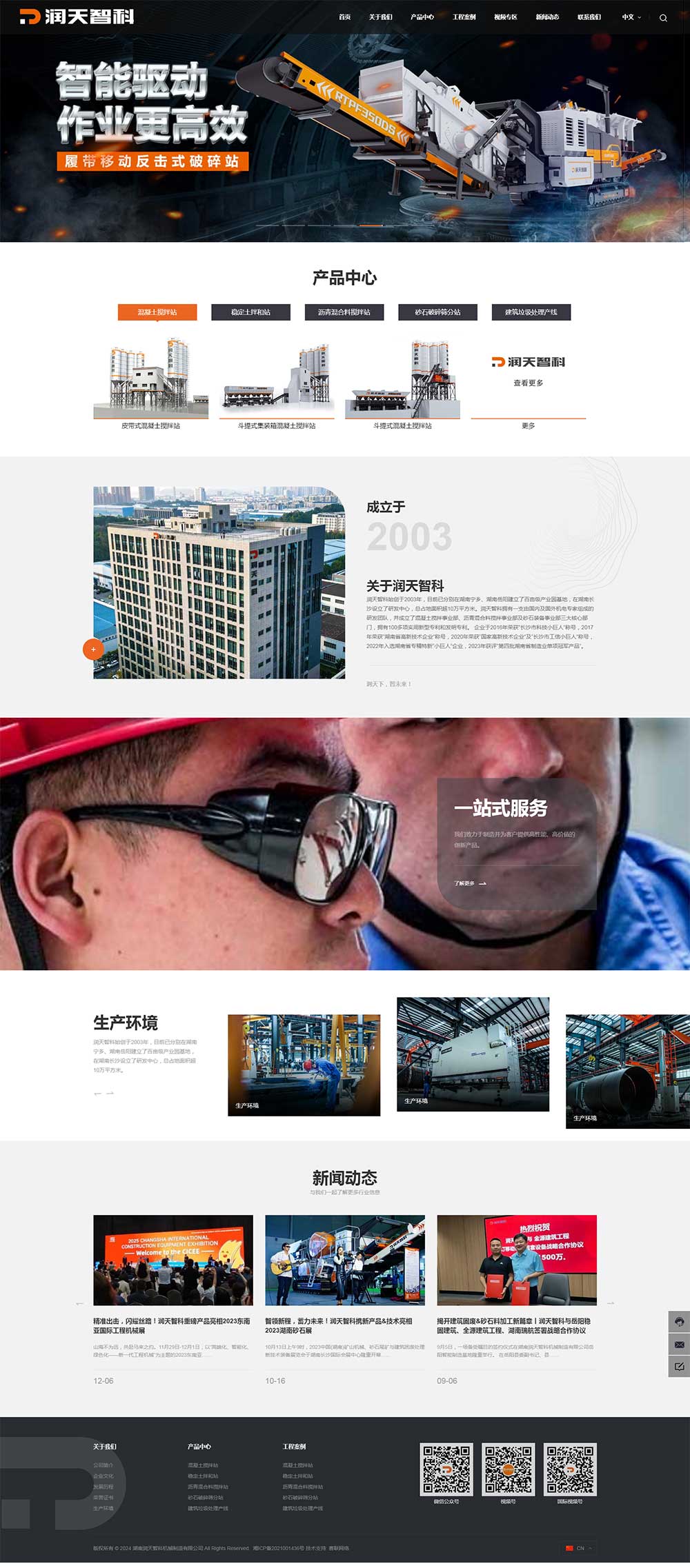润天智科始创于2003年,目前已分别在湖南宁乡、湖南岳阳建立了百亩级产业园基地,在湖南长沙设立了研发中心,总占地面积超10万平方米。润天智科拥有一支由国内及国外机电专家组成的研发团队,并成立了混凝土搅拌事业部、沥青混合料搅拌事业部及砂石装备事业部三大核心部门,拥有100多项实用新型专利和发明专利。