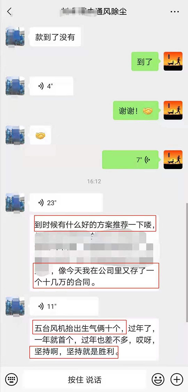 这不仅因为老板诚信,还因为老板今天又签了个十多万的单子:5台风机1台除尘器。(语音自动转文字略有不准)