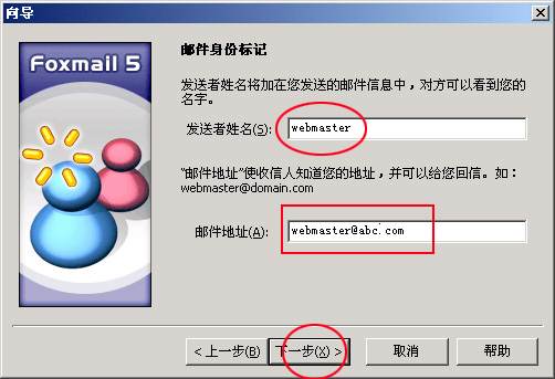4、输入自己姓名(如webmaster)和自己的邮箱地址(如webmaster@abc.com),接着按“下一步”,界面如下: