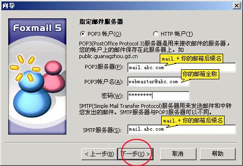 5、在POP3服务器那栏输入你的域名,然后在前面加个mail(例如mail.abc.com),在POP3 帐户名那栏输入你自己完整的邮箱帐号和密码,在SMTP服务器那栏输入你的域名,然后在前面加个mail(例如mail.abc.com),接着点击〈下一步〉, 界面如下: