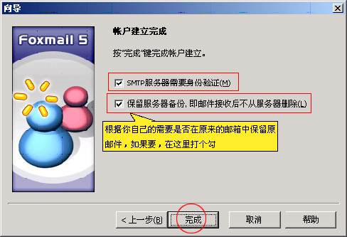 6、选中"SMTP身份验证",然后根据你自己的需要是否在原来的邮箱中保留原邮件,如果要,就在"保留服务器备份"这个可选项中打勾,接着按〈完成〉,界面如下: