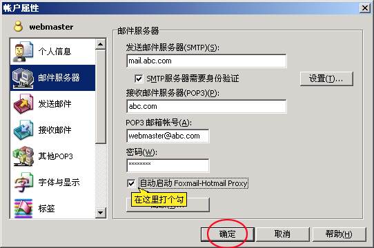 9、在"自动启动Foxmail-hotmail Proxy"选项前打个勾,单击〈确定〉,至此为止,Foxmail新建邮箱的设置已经完成。